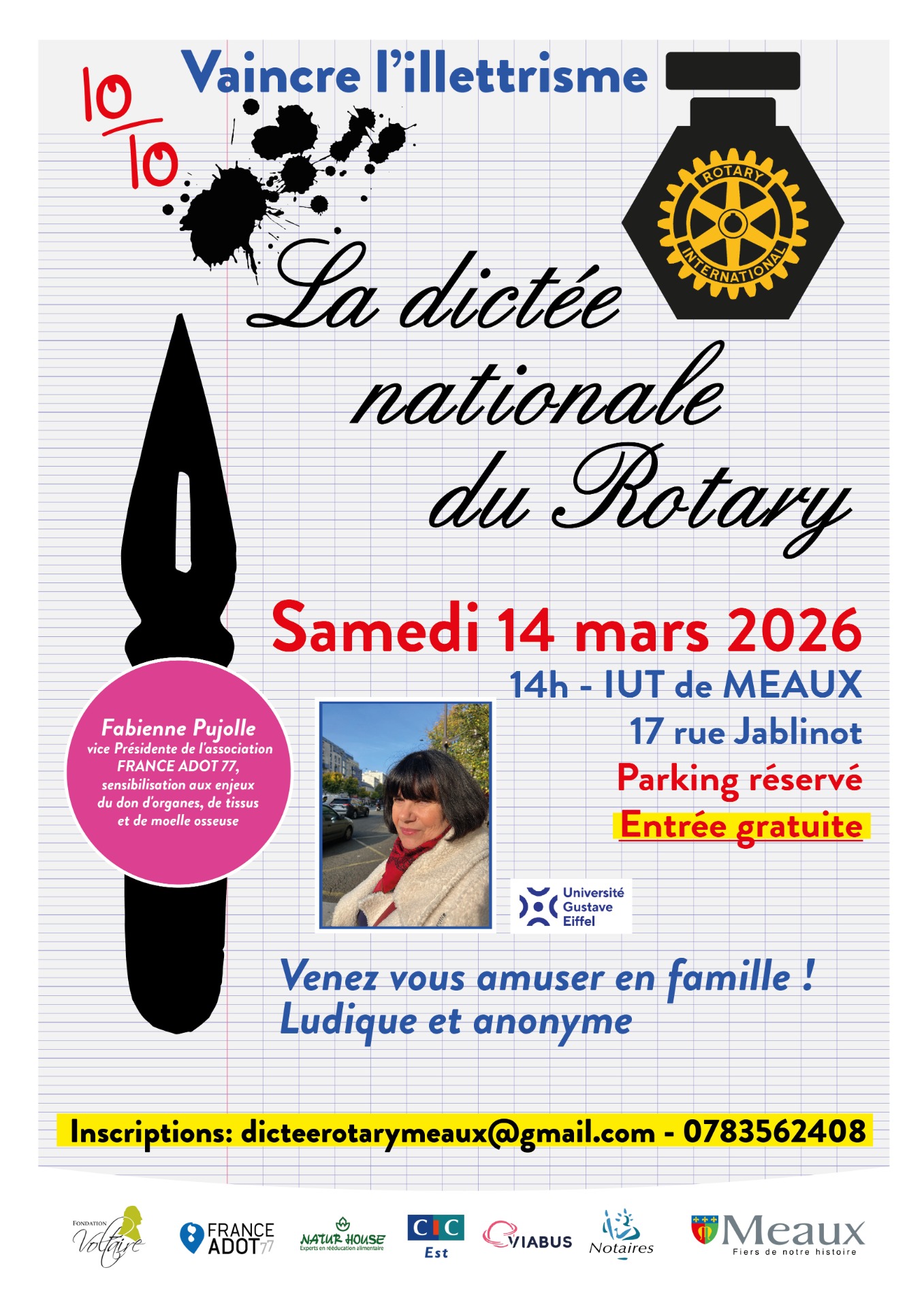 Événement Save the date Samedi 14 mars 2026 : la 9e Dictée Nationale du Rotary se déroulera partout en France !Et c'est à #Meaux, en Seine-et-Marne, que le Rotary Club de Meaux (@rotary_meaux) donne rendez-vous aux petits et aux grands pour participer à cet événement anonyme, ludique et convivial, de 14h à 17h30. Solidaire, cette #dictée soutient la Réussite Éducative meldoise. Mais… la #solidarité ne s'arrête pas là : le stylo bille bleu s'associe au ruban vert !Cette année, c'est notre association France Adot 77 (@franceadot77) qui a été choisie pour être marraine de l'événement. Après l'entracte, notre Vice-Présidente Fabienne sensibilisera le public sur la cause du don d'organes, de tissus humains et de moelle osseuse. Une occasion de présenter les activités et les projets portés par l'association et qui se déploient exclusivement dans ce département.Prêt ? Alors… à vos stylos ! Modalités de l'événement