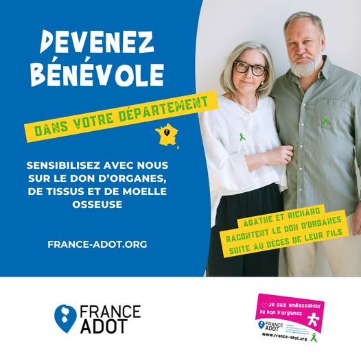 Agathe et Richard ont perdu leur fils. Dans cette terrible épreuve ils ont respecté sa volonté de faire un don d'organes. Aujourd'hui ils sensibilisent le public et racontent leur histoire.Le bénévolat avec France Adot 77, c'est aussi accueillir cette parole des proches de donneurs.Un engagement d'une force incroyable, pour que d'autres vies continuent.Votre écoute votre empathie, votre présence ...C'est tout ce dont nous avons besoin.Rejoignez France Adot 77 comme bénévole.